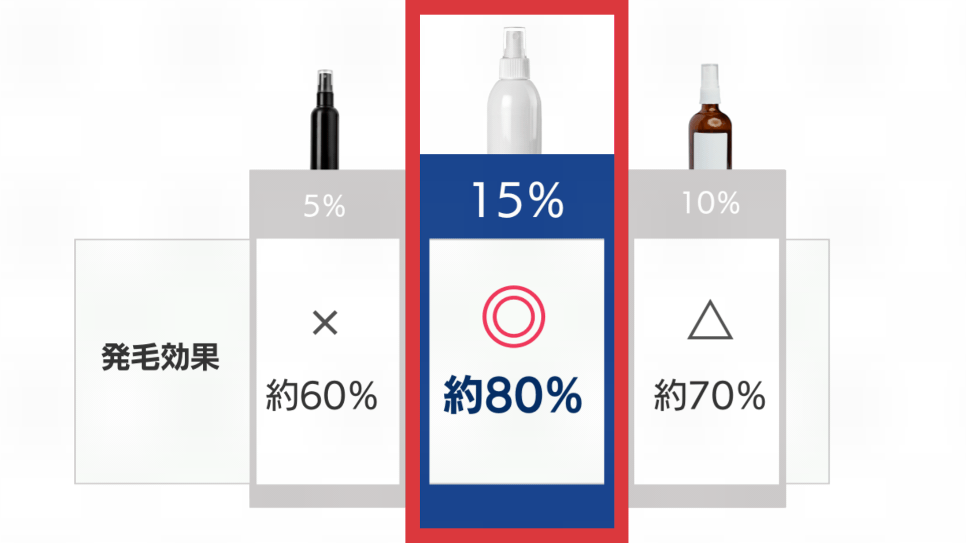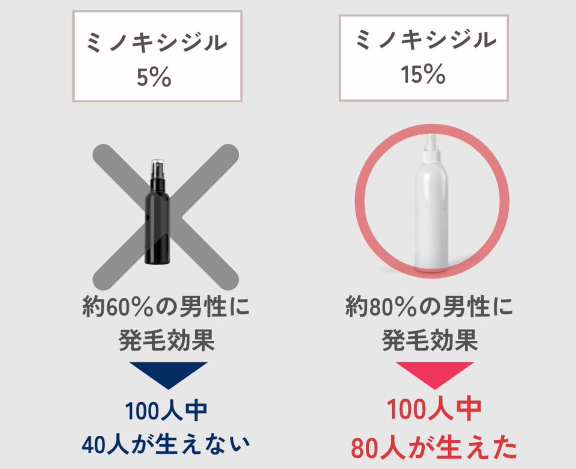 より確実な発毛効果を期待するなら、市販の育毛剤ではなく、臨床試験などで約8割の発毛効果が示されている15%濃度のミノキシジル外用薬を使用する方が、高い確率で発毛を実感できる可能性があります。