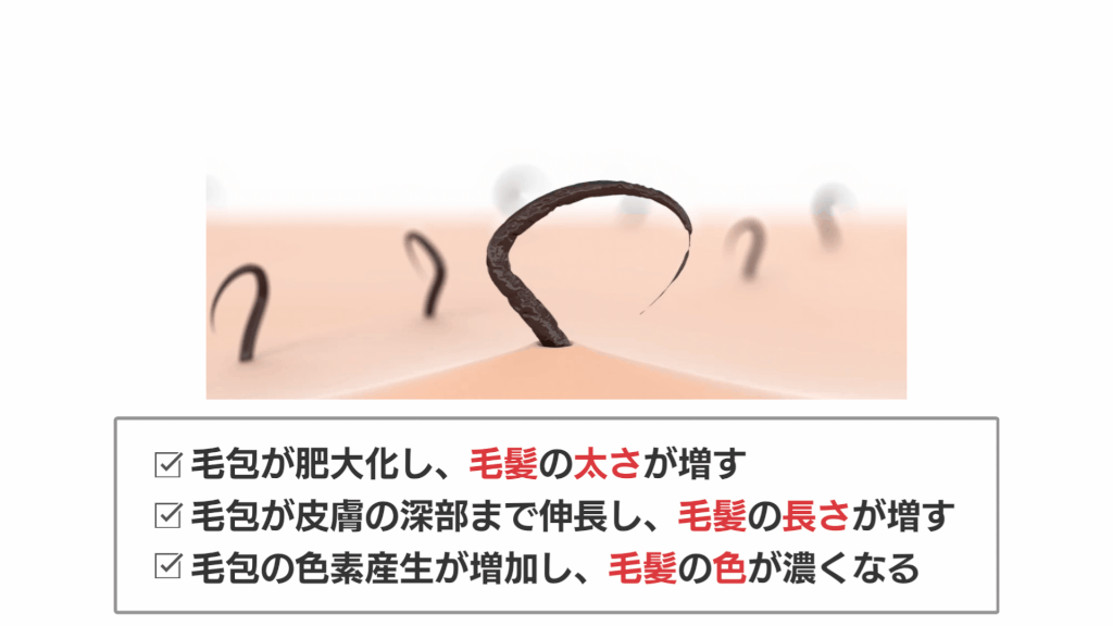ミノキシジルを頭皮に塗ることで、毛包への血流が良くなり、髪が太く長く、そして黒々とする効果が期待できます。