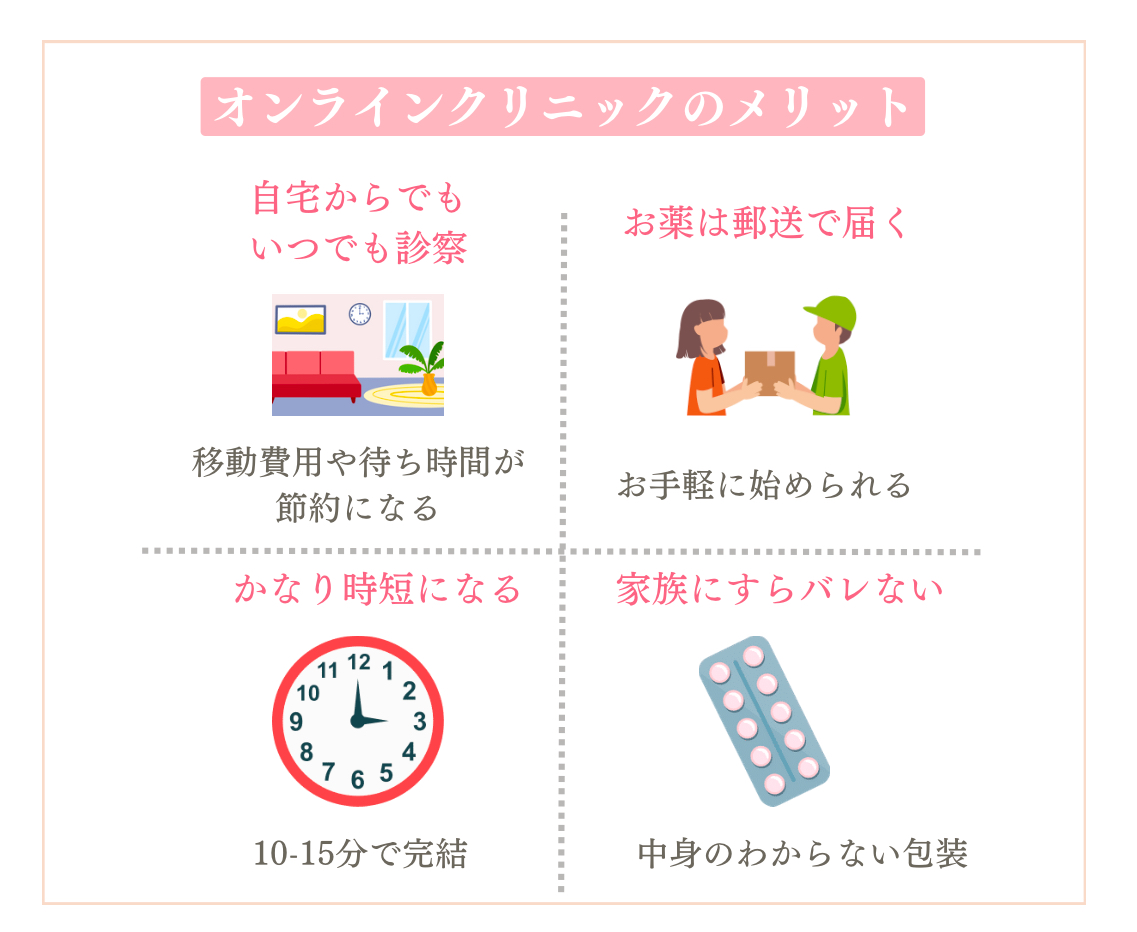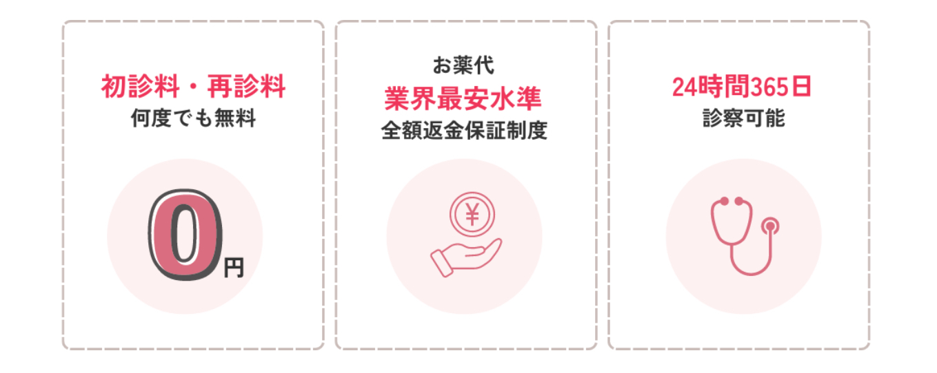 | 診察時間/当日予約/薬の発送 | 10時〜22時/あり/最短当日発送 |
