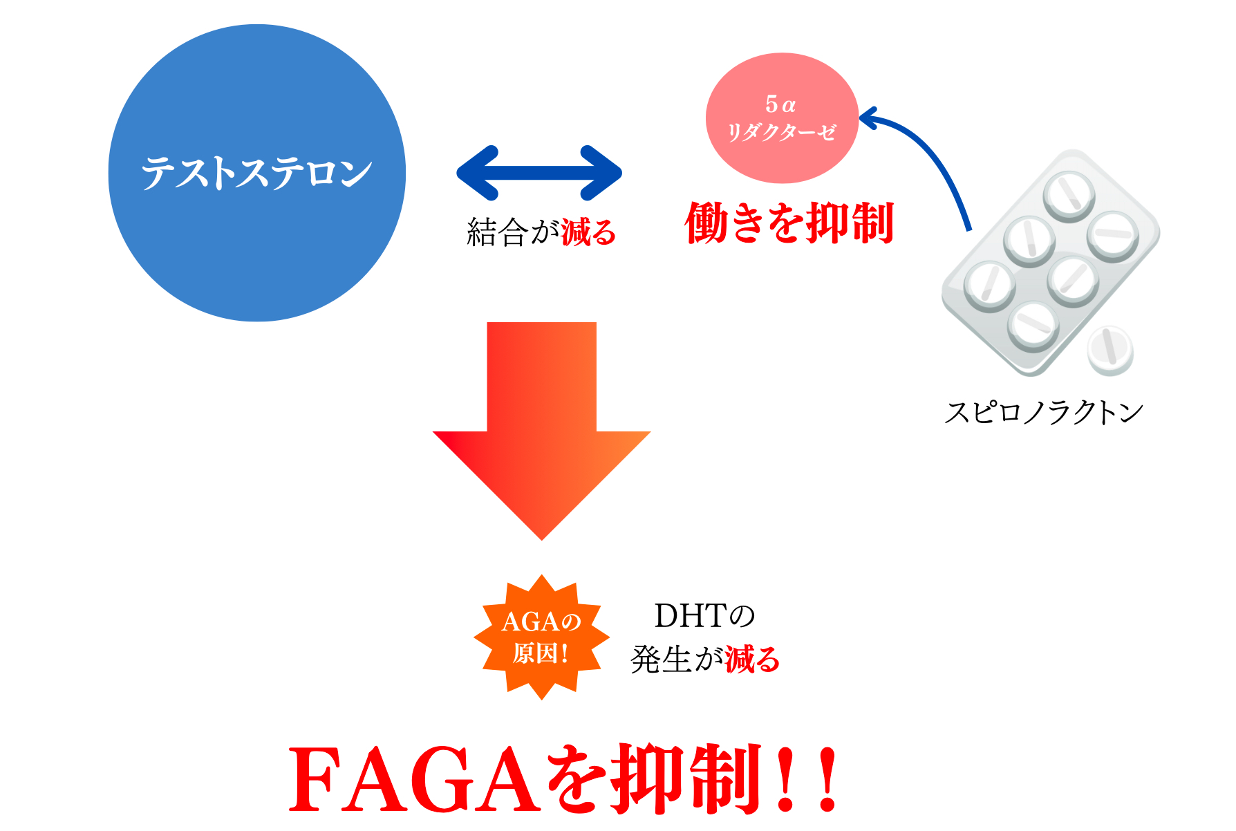 スピロノラクトンは、抜け毛の原因でもあるジヒドロテストステロン(DHT)の作用を抑える働きをします。