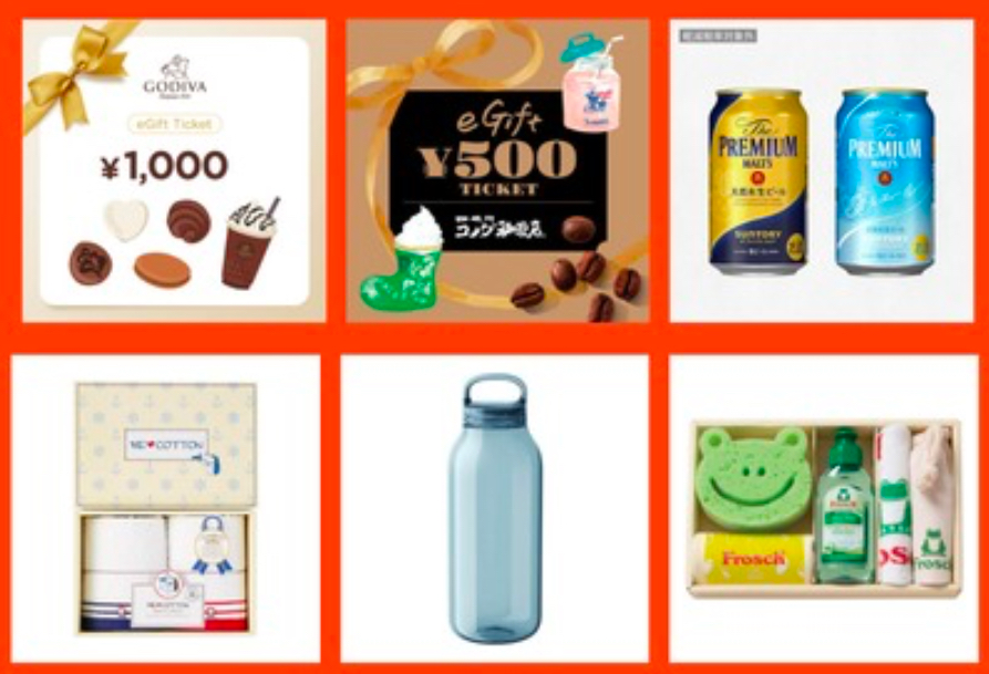 | ・博多もつ鍋2人前 ・ゆめぴりか300g×2 ・ハンバーグステーキ ・USB卓上加湿器 ・パンケーキミックス ・スターバックスラテギフト | ・近江牛小間切れ200g ・ゆめぴりか2kg ・タンブラー300ml×2 ・アンパンマン皿 ・クーラーバッグ ・ハンドクリーム300ml | ・ゴディバギフト券1,000円 ・コメダ珈琲eギフト500円×2 ・プレミアムモルツ ・今治フェイスタオルセット ・ウォーターボトル300ml ・フロッシュキッチンセット |